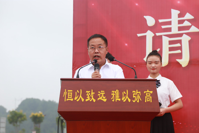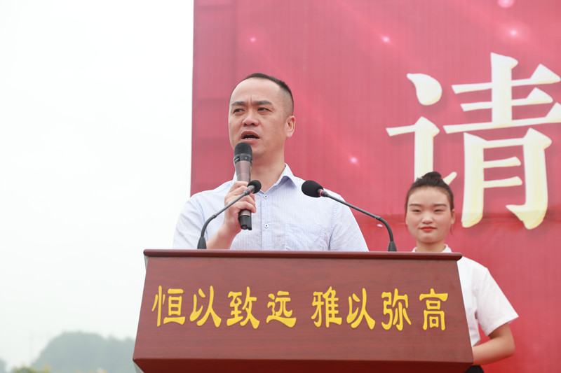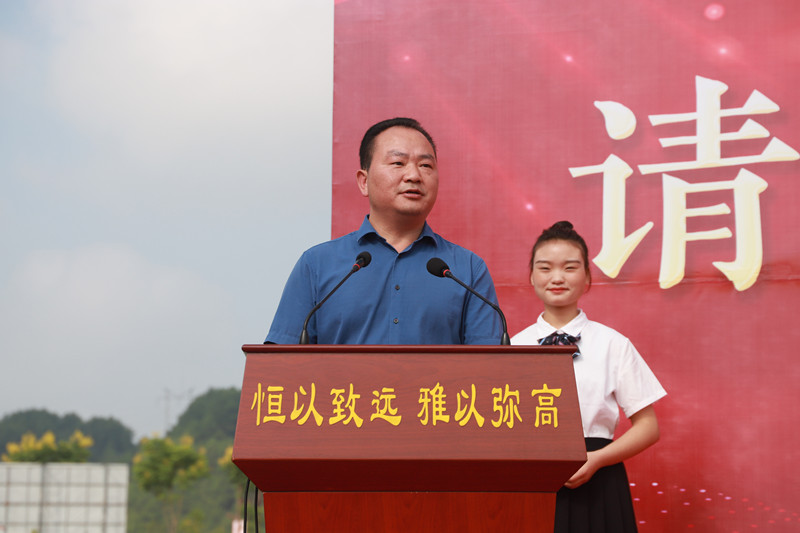 廖校長為各年級(jí)授旗,創(chuàng)新部主任梁莊貴、高三年級(jí)主任李武志、高二年級(jí)主任薛代秀、高一年級(jí)主任楊長勛從廖校長手中接過象征本年級(jí)靈魂的年級(jí)旗。
